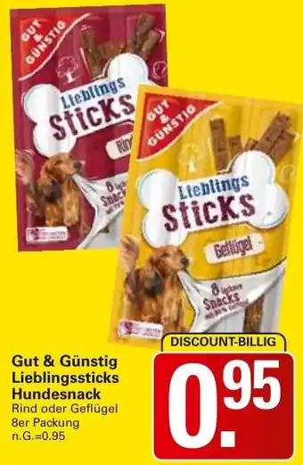 Jetzt im Angebot bei WEZ: Gut & Günstig Lieblingssticks Hundesnack ✅ Aktion gültig vom 5-01 bis 10-01.