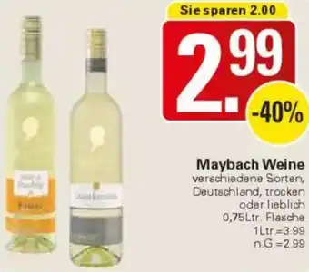 Den Preis von dem Maybach Weine finden Sie auch oben auf der Website, zusammen mit dem Datum, ab wann das Angebot erhältlich ist. Sie können die Preise auch im aktuellen WEZ Prospekt nachhalten oder auf der WEZ Website nachschauen. Durch die Angebote können Sie sicher sein, die WEZ Produkte zum absoluten Bestpreis zu ergattern.
