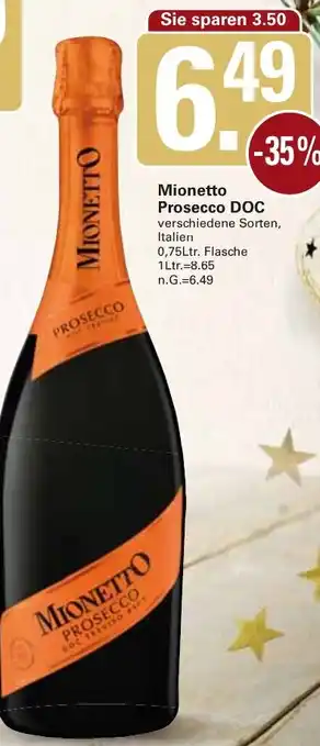 Den Preis von dem Mionetto Prosecco DOC finden Sie auch oben auf der Website, zusammen mit dem Datum, ab wann das Angebot erhältlich ist. Sie können die Preise auch im aktuellen WEZ Prospekt nachhalten oder auf der WEZ Website nachschauen. Durch die Angebote können Sie sicher sein, die WEZ Produkte zum absoluten Bestpreis zu ergattern.