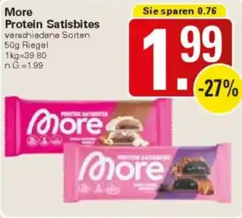 Den Preis von dem More Protein Satisbites finden Sie auch oben auf der Website, zusammen mit dem Datum, ab wann das Angebot erhältlich ist. Sie können die Preise auch im aktuellen WEZ Prospekt nachhalten oder auf der WEZ Website nachschauen. Durch die Angebote können Sie sicher sein, die WEZ Produkte zum absoluten Bestpreis zu ergattern.