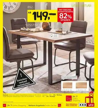 Den Preis von dem Linea natura esstisch finden Sie auch oben auf der Website, zusammen mit dem Datum, ab wann das Angebot erhältlich ist. Sie können die Preise auch im aktuellen XXXLutz Prospekt nachhalten oder auf der XXXLutz Website nachschauen. Durch die Angebote können Sie sicher sein, die XXXLutz Produkte zum absoluten Bestpreis zu ergattern.