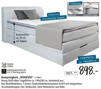 Boxspringbett ,,MODESTO" ist jetzt im Angebot bei Zurbrüggen, gültig vom 09-01-2026 bis 26-01-2026. Besuchen Sie die Website von Zurbrüggen oder kaufen Sie Boxspringbett ,,MODESTO" direkt im Geschäft. Auf Prospektangebote.de finden Sie immer die besten aktuellen Aktionen. Vergleichen Sie Boxspringbett ,,MODESTO" mit anderen Angeboten und prüfen Sie, ob sich ein Kauf jetzt lohnt. Behalten Sie kommende Aktionen im Blick, denn manche Produkte sind nur nächste Woche oder nur vor Ort verfügbar.Häufig gestellte Fragen über Boxspringbett ,,MODESTO"