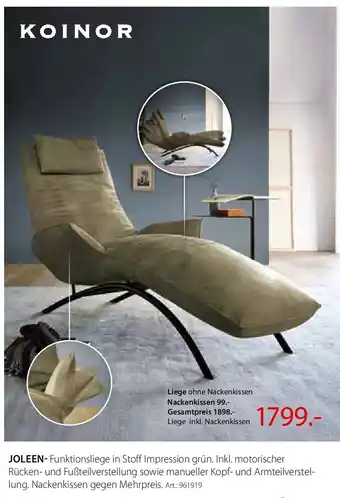 Diese Woche ist KOINOR JOLEEN Funktionsliege in Stoff bei Zurbrüggen reduziert erhältlich. Hier finden Sie alle Informationen zu Preisen, Aktionsdetails und Laufzeit. Prüfen Sie weitere KOINOR JOLEEN Funktionsliege in Stoff Aktionen, um sicherzugehen, dass Sie den besten Preis erhalten. Die KOINOR JOLEEN Funktionsliege in Stoff Aktion gilt in Kalenderwoche 03. Nach Ablauf zeigen wir Ihnen vergleichbare Alternativen. Abonnieren Sie die Kategorie, um beim nächsten Mal direkt informiert zu sein, wenn KOINOR JOLEEN Funktionsliege in Stoff wieder reduziert ist.Häufig gestellte Fragen über KOINOR JOLEEN Funktionsliege in Stoff