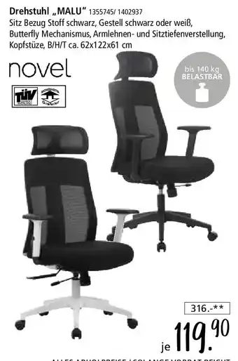 Jetzt im Angebot bei Zurbrüggen: Novel Drehstuhl ,,MALU" ✅ Aktion gültig vom 9-01 bis 26-01.