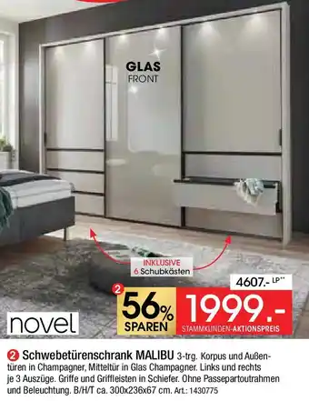 Den Preis von dem Novel Schwebetürenschrank MALIBU finden Sie auch oben auf der Website, zusammen mit dem Datum, ab wann das Angebot erhältlich ist. Sie können die Preise auch im aktuellen Zurbrüggen Prospekt nachhalten oder auf der Zurbrüggen Website nachschauen. Durch die Angebote können Sie sicher sein, die Zurbrüggen Produkte zum absoluten Bestpreis zu ergattern.