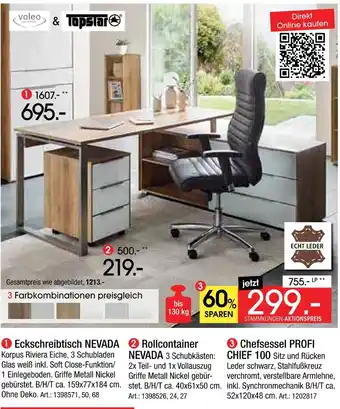 Den Preis von dem Voleo eckschreibtisch nevada finden Sie auch oben auf der Website, zusammen mit dem Datum, ab wann das Angebot erhältlich ist. Sie können die Preise auch im aktuellen Zurbrüggen Prospekt nachhalten oder auf der Zurbrüggen Website nachschauen. Durch die Angebote können Sie sicher sein, die Zurbrüggen Produkte zum absoluten Bestpreis zu ergattern.